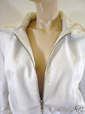 The back of the jacket is absolutely fabulous with a versatile fur collar detail that can be worn fastened via a zip or worn as a hood (see photos) This is a very rare glamorous white leather / fur jacket that is sure to make any outfit stand out in the crowd. It is absolutely fantastic worn day or evening This jacket can no longer be purchased in store