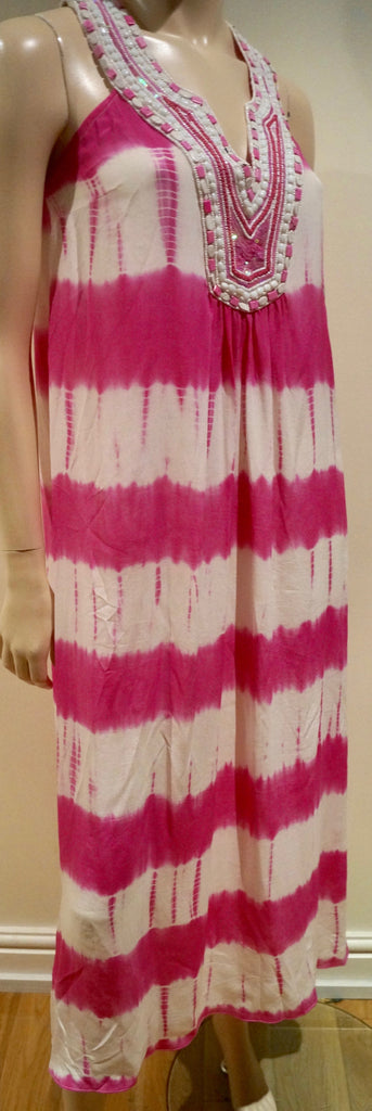 ELIZABETH HURLEY BEACH Pink & White Silk Tie Dye Sleeveless Beaded Maxi Dress S