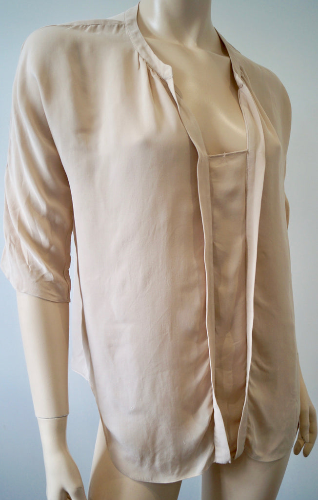 REBECCA TAYLOR Nude Beige 100% Silk Collarless 3/4 Sleeve Blouse Shirt Top UK10