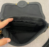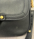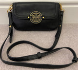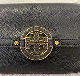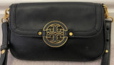 TORY BURCH Black Pebbled Leather Gold Tone Branded Flap Over Shoulder Bag