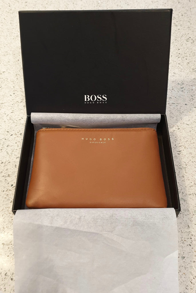 BOSS HUGO BOSS Tan Leather Gold Tone Zipper Small Coin Purse - New With Box
