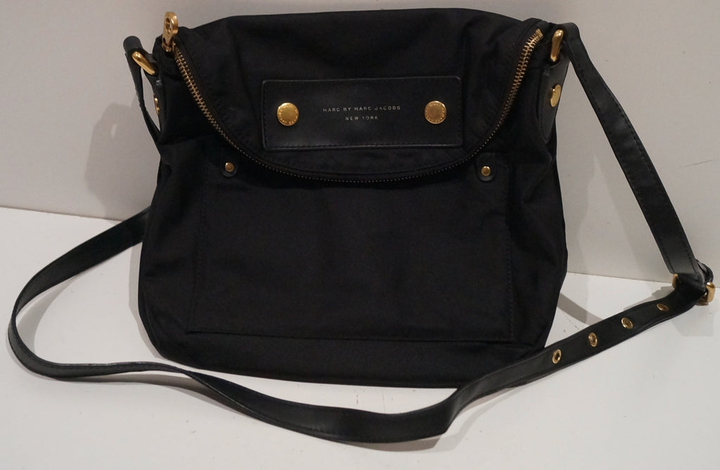 MARC BY MARC JACOBS Black Fabric Leather Gold Tone Zipper Branded Shoulder Bag