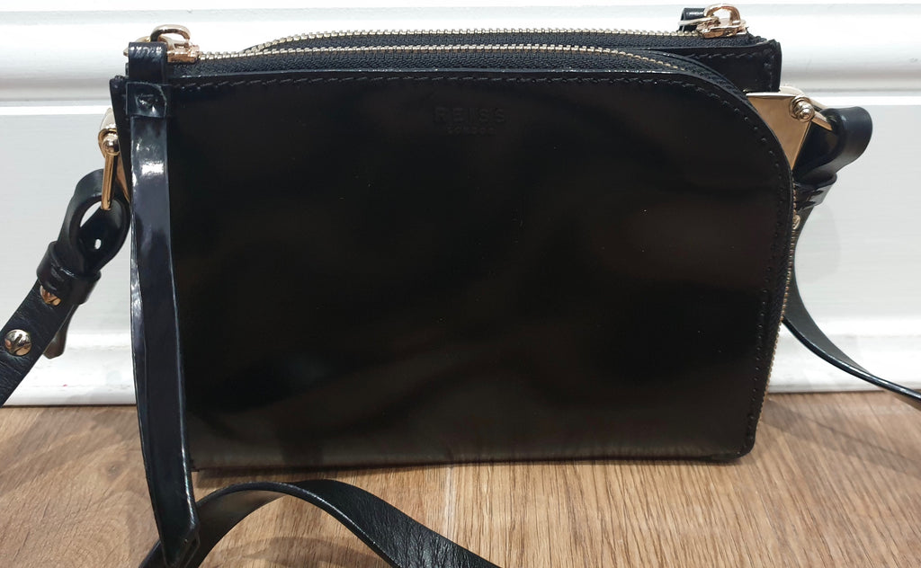 REISS Black Leather Shine ARNOTT Double Pouch Zipper Cross Body Shoulder Bag