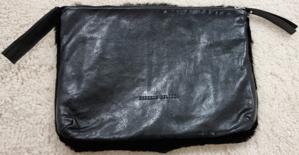 SHERENE MELINDA LONDON Black Leather & Springbok Hair Zip Fasten Clutch Bag