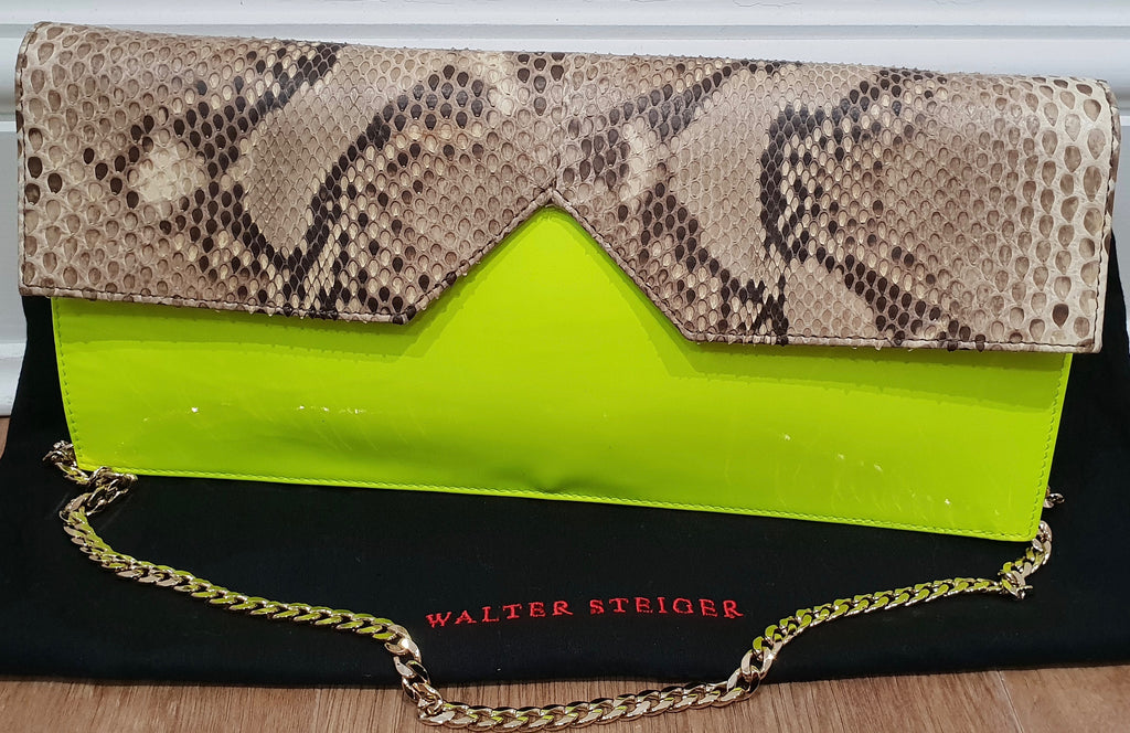 WALTER STEIGER Neon Yellow Beige Snake Print Leather Small Clutch Shoulder Bag